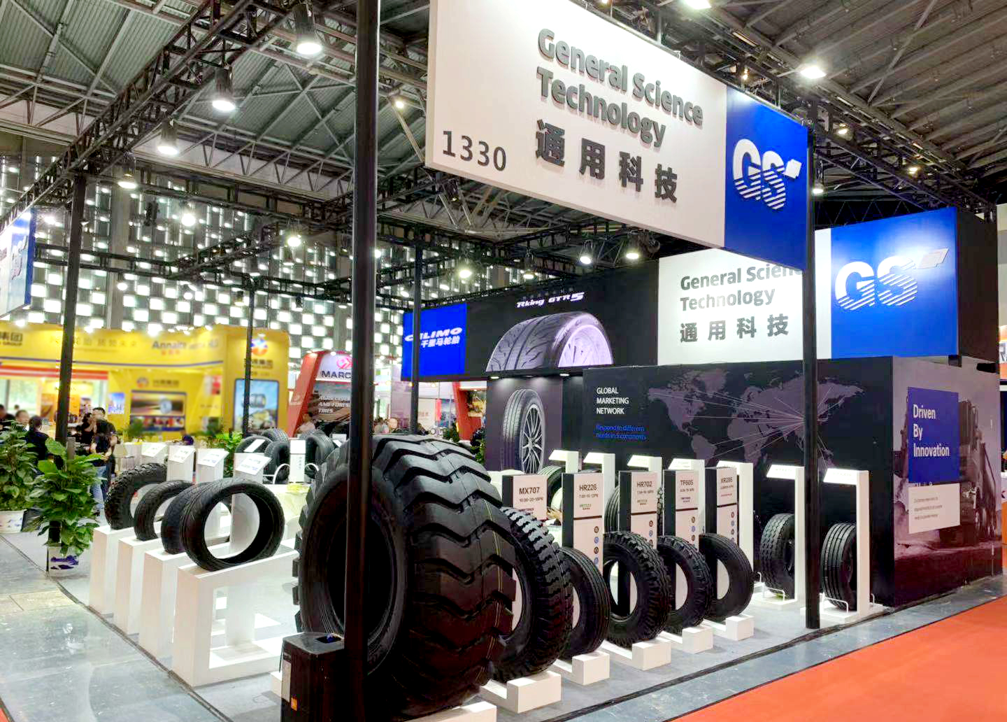 本次展會,通用股份展臺設(shè)計以標(biāo)志性品牌顏色——藍(lán)色為主題調(diào),展廳整體色系統(tǒng)一、層次鮮明,凸顯了通用股份科技、創(chuàng)新、未來的產(chǎn)品設(shè)計理念,向用戶展示了通用始終以提升創(chuàng)新能力為核心,大力推進(jìn)智能制造,打造世界一流民族輪胎品牌的發(fā)展愿景。