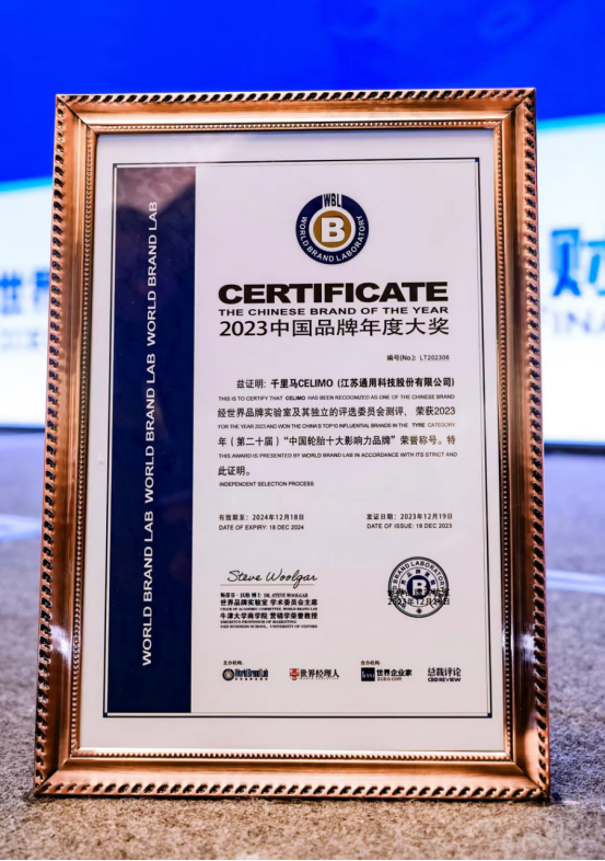 12月19日,2023年“中國品牌年度大獎(jiǎng)”評選在“世界經(jīng)理人峰會(huì)”上揭曉。通用股份憑借強(qiáng)大的品牌實(shí)力、卓越的創(chuàng)新能力以及優(yōu)異的產(chǎn)品品質(zhì),再度榮獲2023“中國輪胎十大影響力品牌”。
