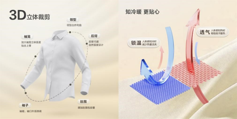 所謂0感,指的是“0壓、0皺、0摩擦、0束縛”。0感舒適襯衫首創(chuàng)紅豆超細旦纖維,輕如羽毛,彈性十足,透氣性極佳,即便炎炎夏日,也能感受到如沐春風(fēng)般的涼爽與自在。同時,創(chuàng)新運用瑞士HeiQ智能控溫科技,讓面料擁有感知外界溫度并自動調(diào)節(jié)的能力,實現(xiàn)“熱縮冷脹”智能溫控效果,在任何環(huán)境下都能保持恰到好處的舒適。
