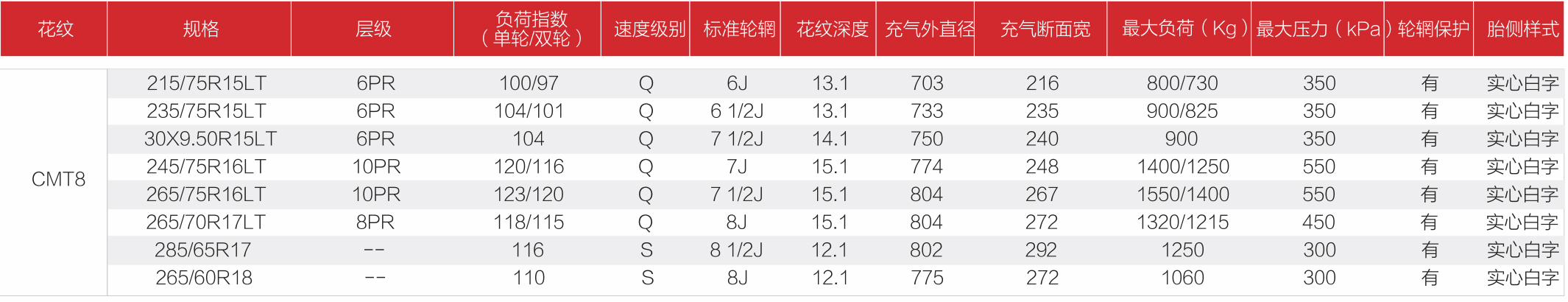 YUNCHANG M/T CMT8 使用高耐磨型橡膠配方,增強(qiáng)花紋塊結(jié)構(gòu),提升輪胎花紋塊強(qiáng)度,增加承載能力。增強(qiáng)化的輪廓結(jié)構(gòu),胎面更平,抓地力更強(qiáng)。